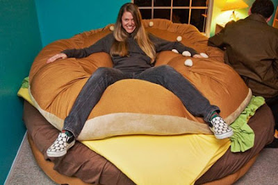 This has got to be the yummiest bed EVAR! Behold the Hamburger Bed (technically it’s a cheeseburger, but who cares?) which comes complete with an oversized bun duvet, as well as tomato and pickle slice pillows.